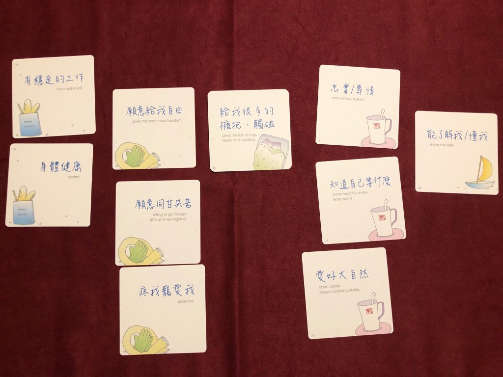 挑選10張的過程中,就可以顯出自己對伴侶的要求與設定,我手上握了一大疊牌不肯放,因為我覺得這些統統很重要!(對對方要求很多!),對方挑出10張的速度很快,因為他清楚在婚姻中什麼才是重要的核心條件。