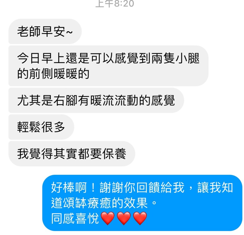 剛離開時,個案的右腳感覺輕鬆。今天一早,都還可以感到右腳的暖流在流動。頌缽的振動與清理,的確能促進循環與代謝。