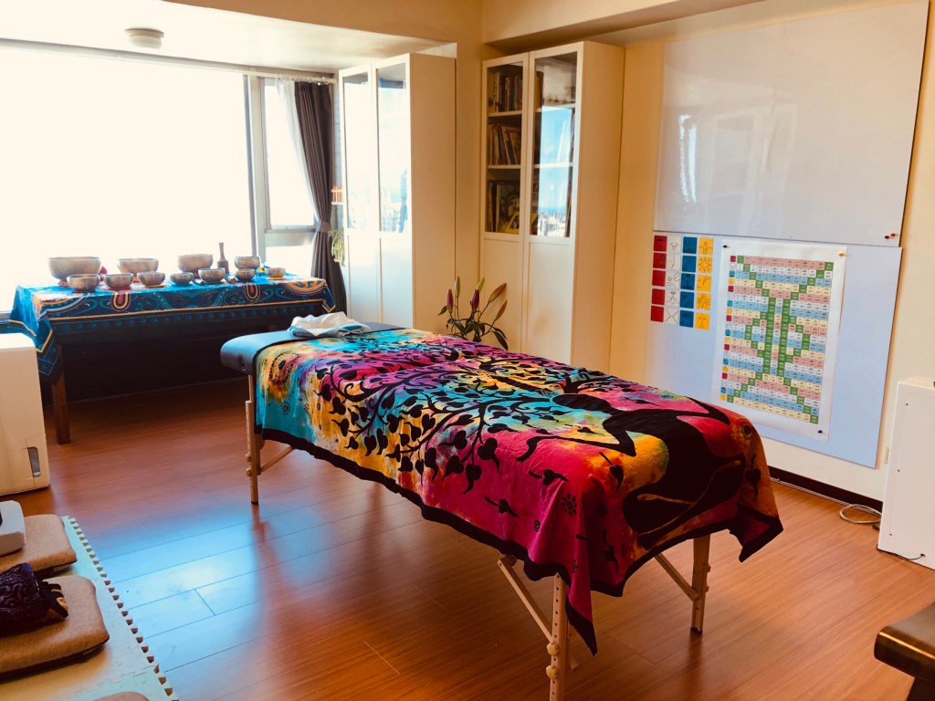 一個多小時,從氣場清理、音波拉皮、到背部、正面全身敲缽,右腳的確有悶悶的聲音。缽的聲音出不來,我試了多敲幾下,補能量進去。