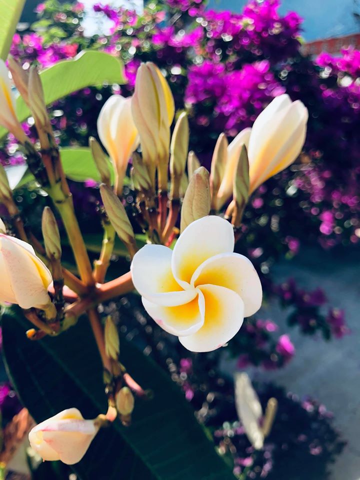 在中部的陽光下,雞蛋花開得特別好。