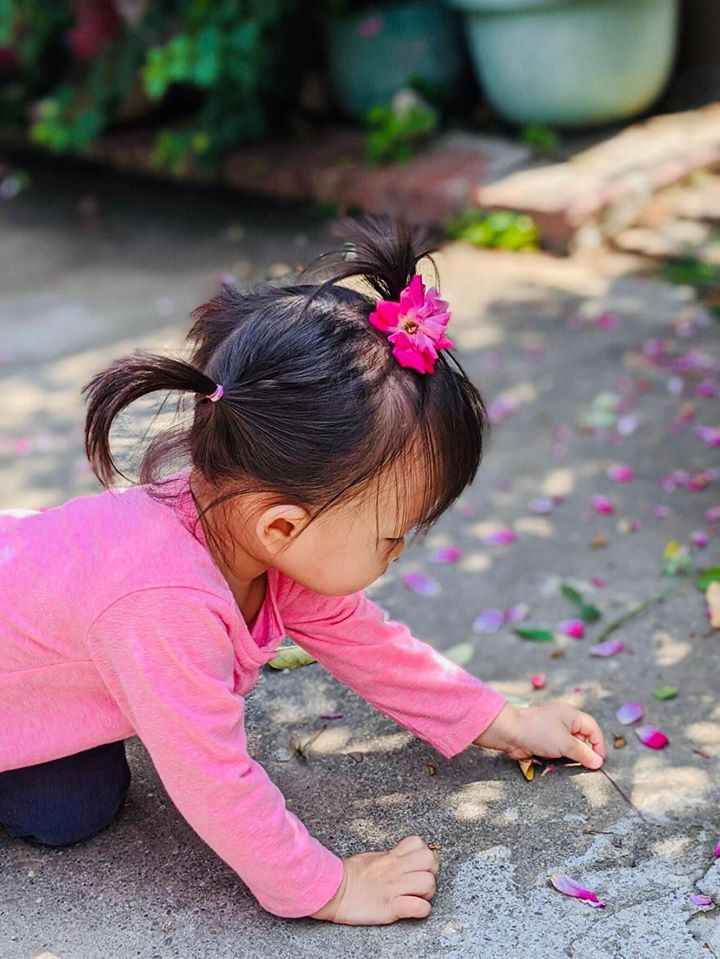 小女孩,撿起花瓣就往嘴裡嚐。