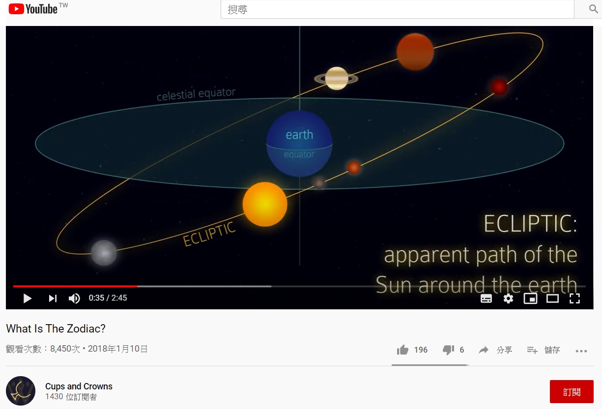 因為下週的占星課,開始找一些資源來看,但接觸到的占星的書籍,總是一開始就進入占星知識的運用,需要更基礎的背景解說…所以就發現相當棒的youtube影片!這兩位用很簡單的圖片與閒聊方式,從非常基礎的、大家會迷惑的觀念開始解釋,今天早上就沉浸在這樣的影片裡「追劇」了…英文好好聽~~